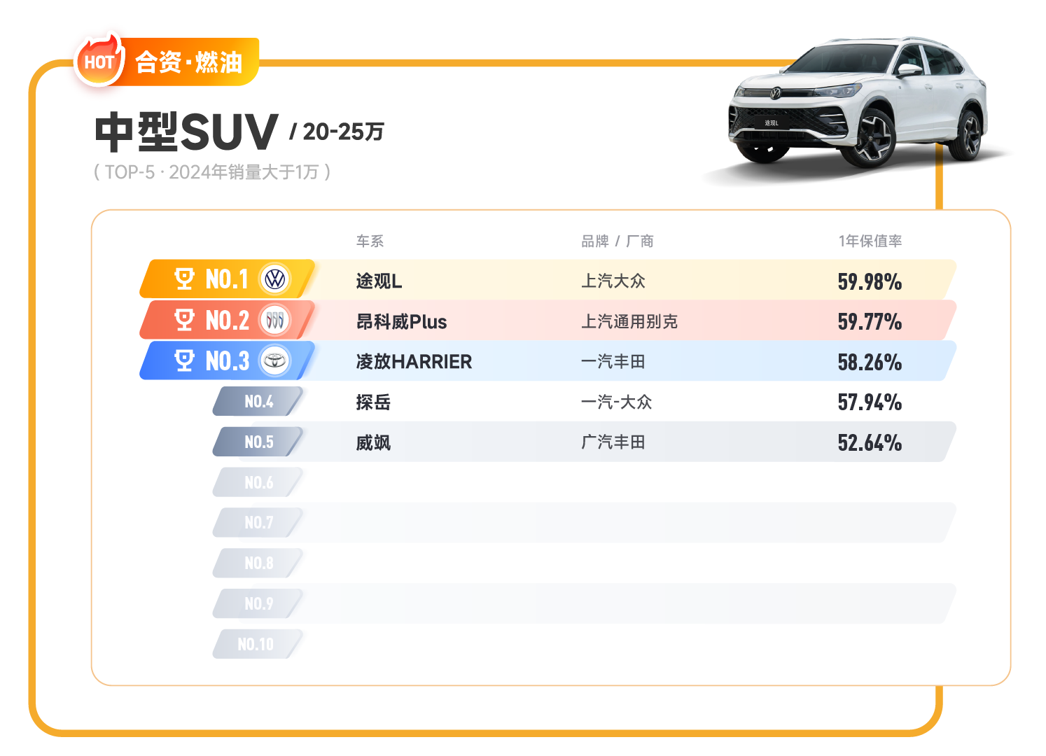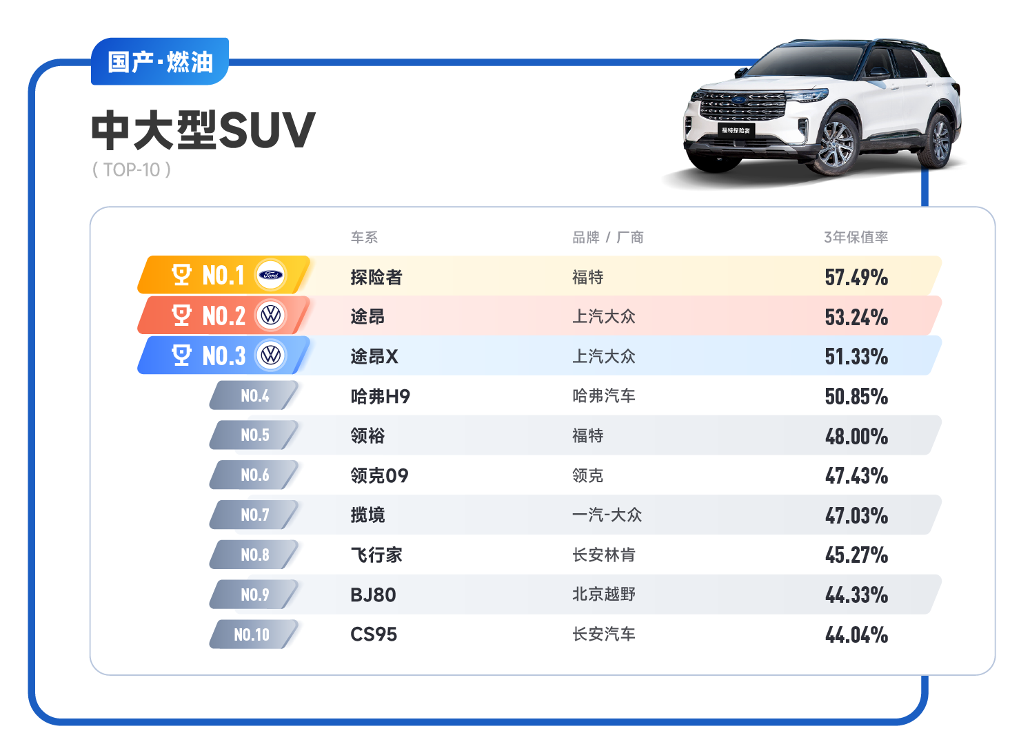 ID.3-合资纯电紧凑型SUV排行榜 无论途昂还是ID系列车型,都以其高品质、造型时尚、保值率优异的特点,赢得了消费者的广泛认可和赞誉。近年来,保值率管理已经应用到汽车行业的多个领域,深入到汽车的全生命周期:从设计、制造、定价、销售、金融、回购、保险到最终的报废回收,保值率无不参与其中,扮演越来越重要的角色。车市“价格战”之下,消费者对于车辆是否保值也更加重视,保值率已成为影响消费者购车决策的重要因素。中国国际贸易促进委员会汽车行业分会汽车金融暨保值率研究委员会也将继续致力于保值率的研究及运用,将更专业、更详尽的数据呈现给大家。 |